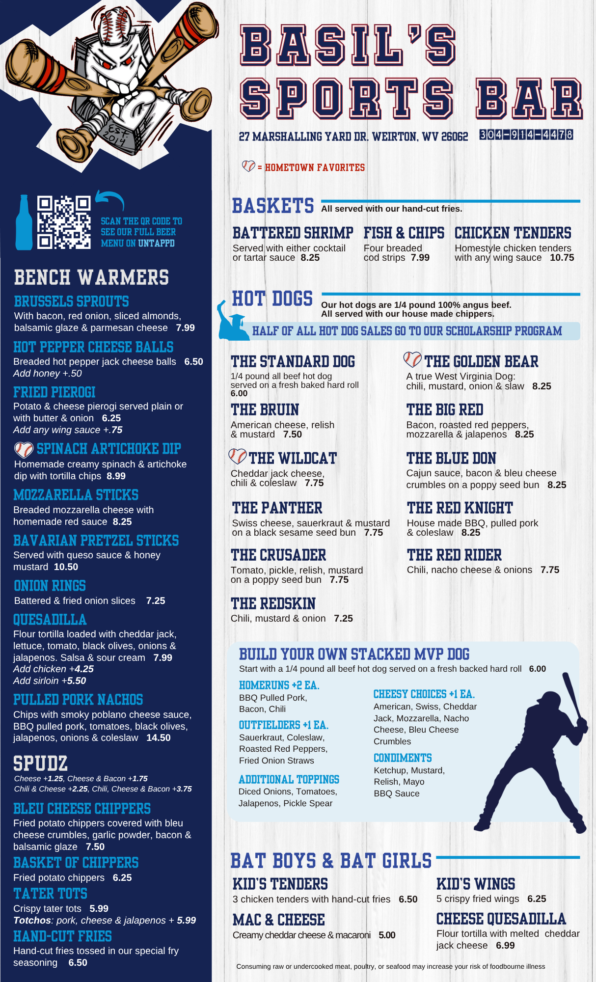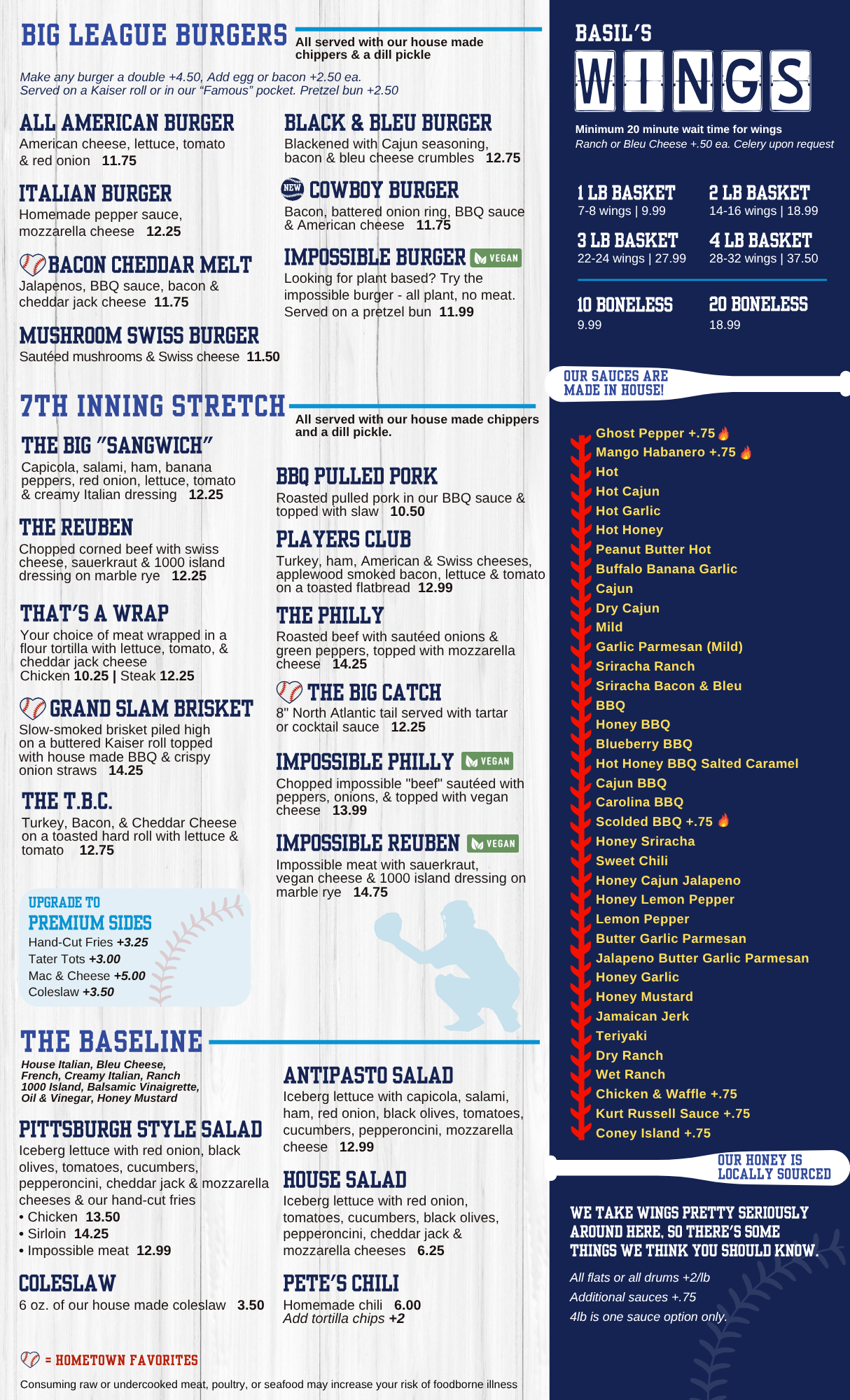 Eat at Basil's Sports Bar and GrillEnjoy our fresh homemade, 1/2 lb. burgers and the Best wings in the valley. View Our Full Food Menu